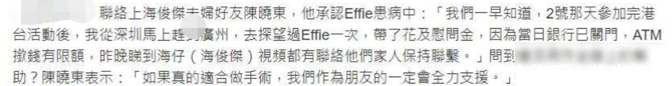 他们的好友、知名歌手陈晓东在接受港媒采访时直言:“我们一早知道这件事。”他透露自己在11月2号参加完活动后就立刻从深圳赶到广州医院探望Effie,不仅带了花还送上了慰问金。他解释当时银行关门,ATM取款又有限额所以没能拿出更多。